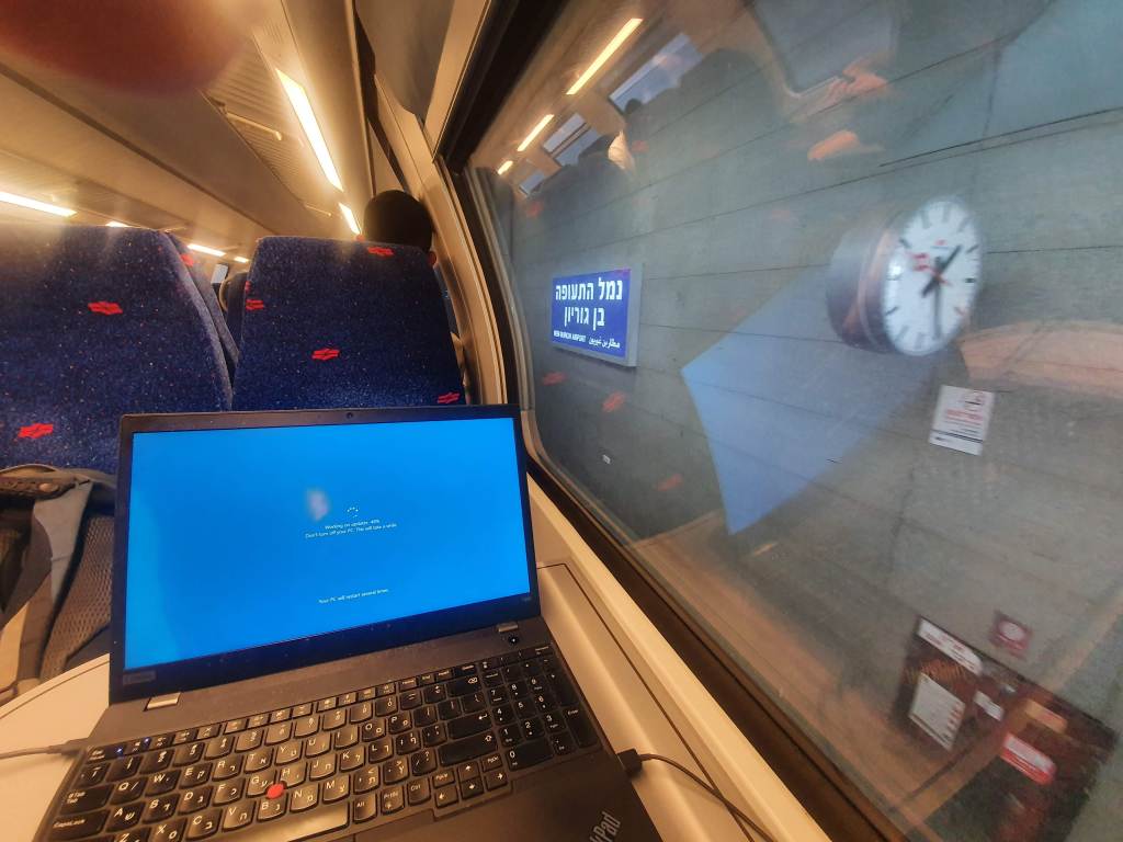 ובאמת, זה היה מהר, ולא הייתי צריך לחפש חניה, ולא התעייפתי בכלל. אבל לעבוד תוך כדי לא הצלחתי. לא בגלל הרכבת. בגלל שה IT החליט לדחוף לי עדכון של הווינדוס. עכשיו. בלי אפשרות לסרב, לערער, או לדחות את ביצוע גזר הדין בשל נסיבות בריאותיות או נסיבות בכלל. עכשיו וזהו.